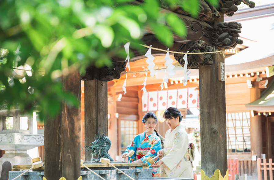 成人式は着付け・ヘアメイクはもちろん、厄払いや受験とも併せて祈願することもできます。大國魂神社では婚礼も行うため、成人式の撮影も婚礼のプロ集団が担当しています。