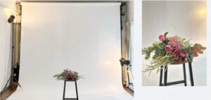 白い背景、グレーの背景、腰板付き背景とスタジオでは3通りの背景があります。どんな撮影にも利用できる白い背景はナチュラルに、グレーの背景は落ち着いた仕上がりになります。腰板付きの上部はラベンダー、下部は装飾のあるモルタル風デザインになっています。ラベンダーと白の淡い色が華やかな着物を引き立てます。